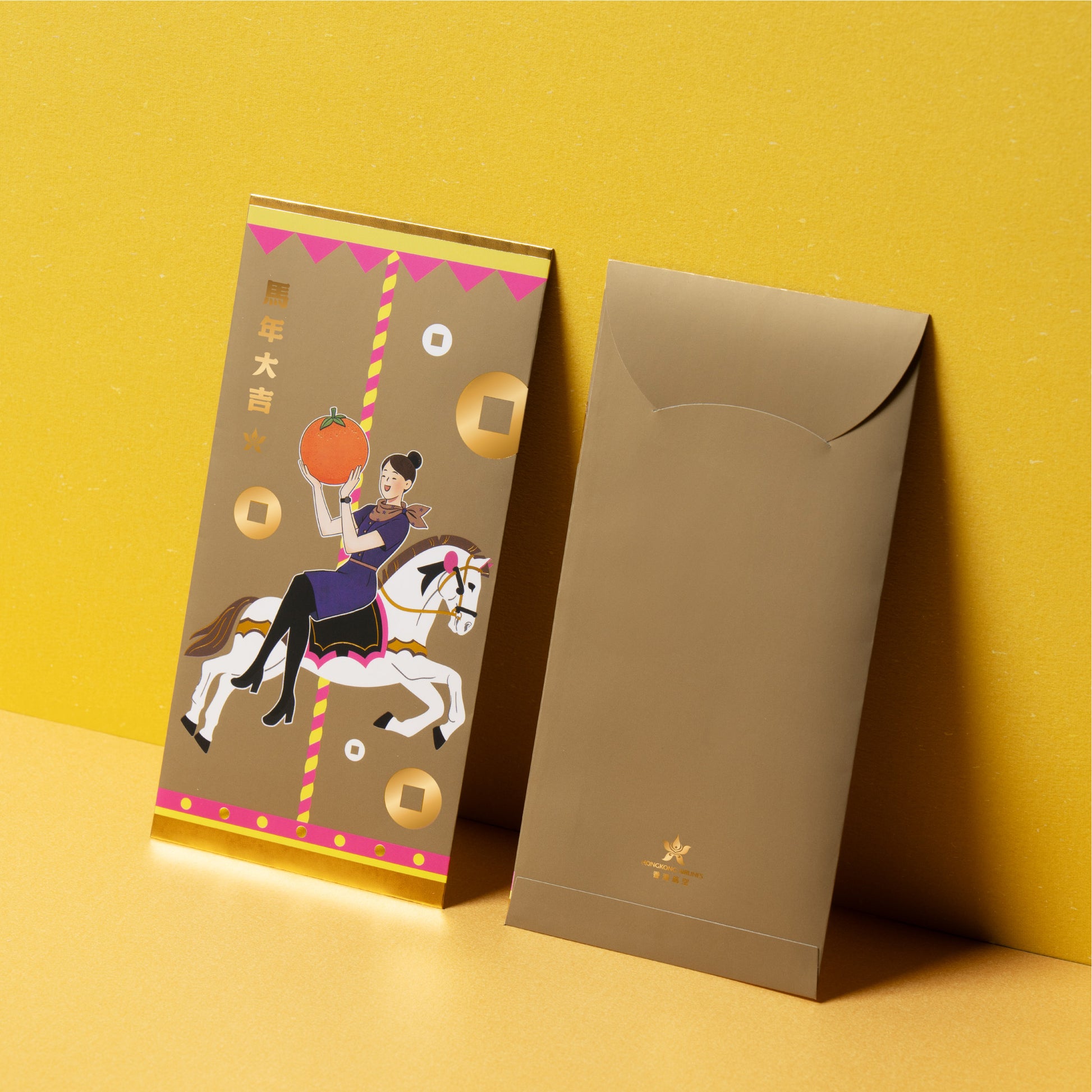 今年香港航空的利是封以香港獨特的中西文化背景為設計靈感,將西洋風的旋轉木馬及服務專業的機組人員為主題,象徵生生不息的吉祥寓意,貨如輪轉,好運轉不停。香港航空期待與閣下一同迎接充滿希望的馬年,祈願來年財運亨通,心想事成,馬上出發!